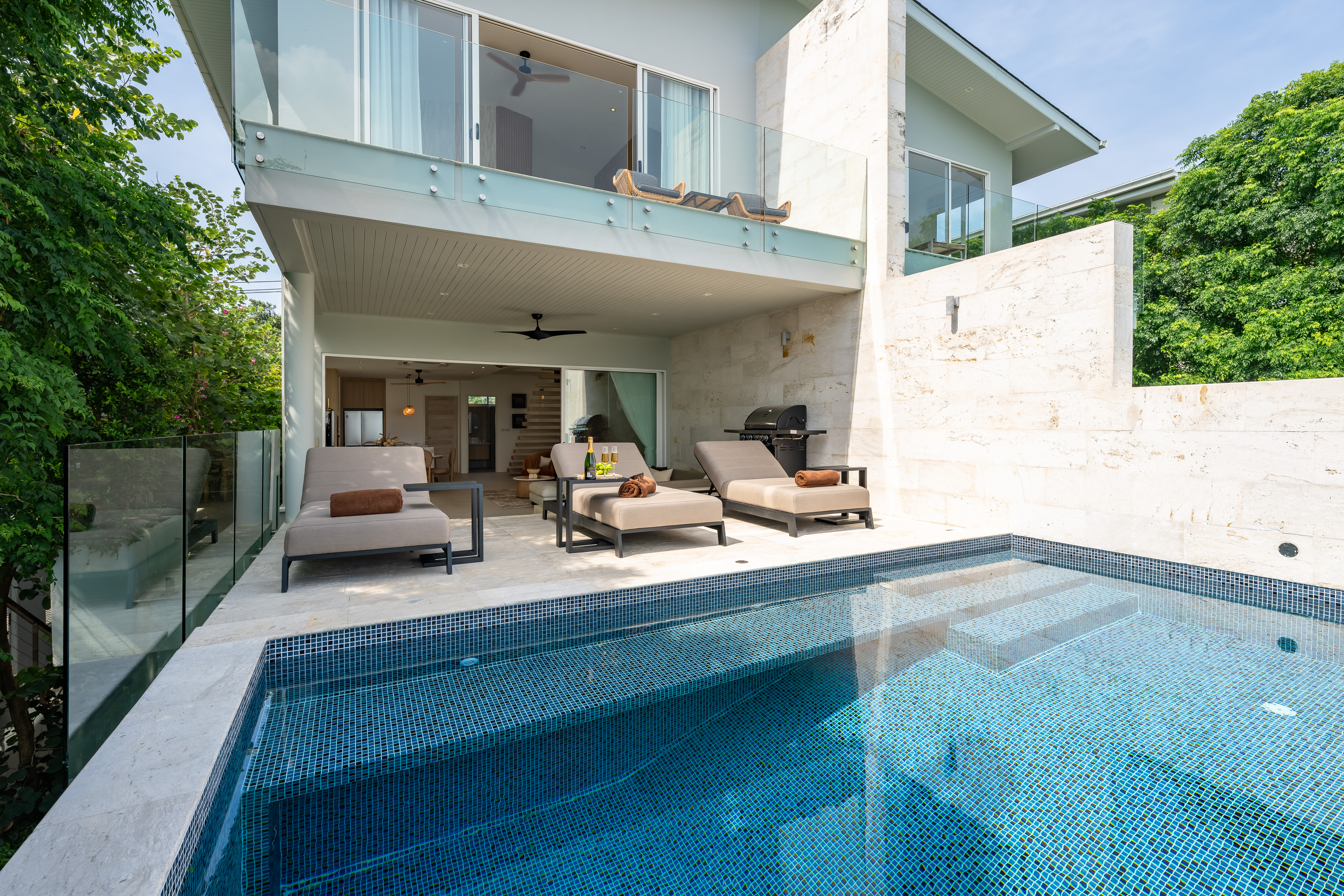 - Open-plan living, dining, and kitchen opening to pool terrace